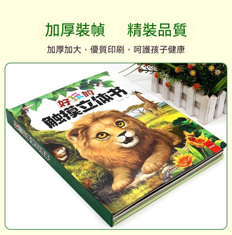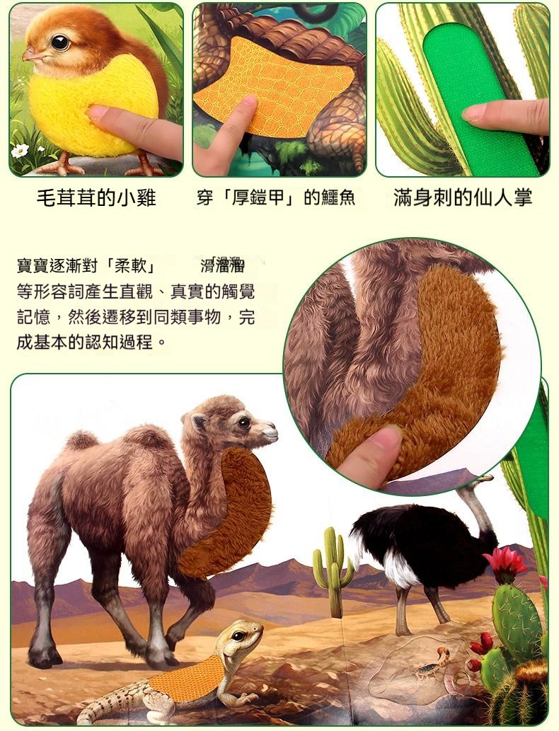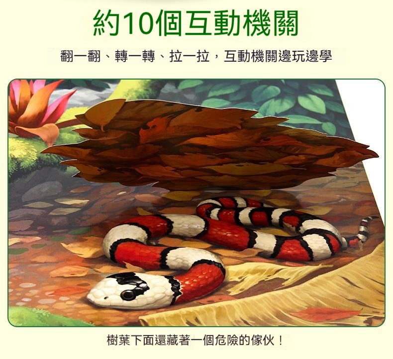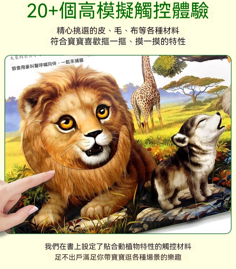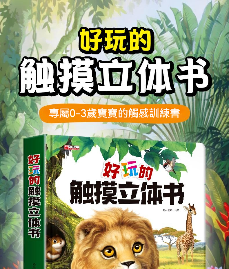 觸摸立體書讓寶寶通過真實觸摸認識到“柔軟”“滑溜溜”等形容詞 ✅20+個高仿真觸摸體驗 ✅巧妙機關設計,翻開書本樹葉下有蛇 ✅多種故事場景:啄木鳥吃害蟲、樹葉下藏蛇、牛尾巴趕蚊子知了吸樹汁等 ✅ 摸得到的叢林:獅子的鬃毛是毛茸茸的